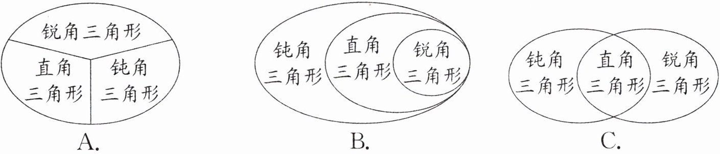 1. 把所有的三角形看作一个整体,那么锐角三角形、直角三角形和钝角三角形的关系可以用下面的(