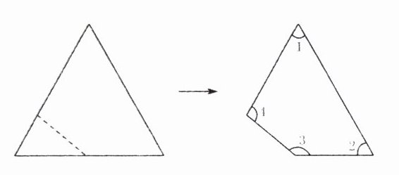 2. 如右上图,把等边三角形沿虚线剪去一个角,在剩下的四边形中,$∠1+∠2=( )^{\circ },∠3+∠4=( )^{\circ }$。