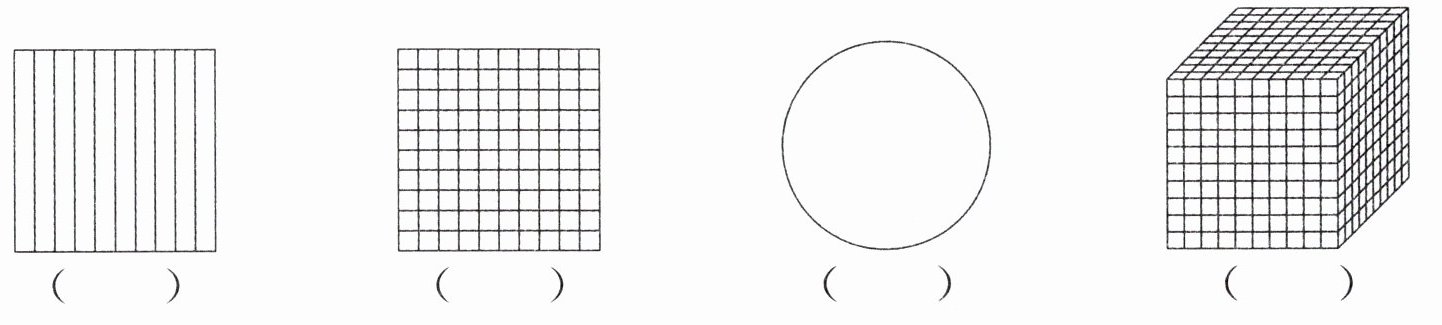 新趋势 数形结合 下面每个图形都表示整数“1”,选择合适的图形,分别涂色表示 1、0.7、0.45、0.012,并在图形下面的括号里写出相应的数。