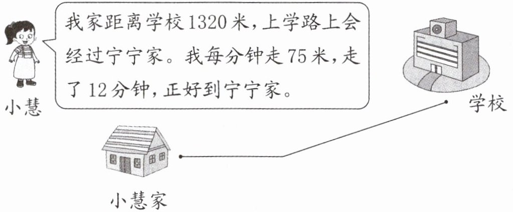 解析:先根据小慧的速度和行走的时间,求出小慧家与宁宁家的距离为75×12=900(米),再根据小慧家与学校的距离,求出宁宁家与学校的距离为1320−900=420(米),最后根据“时间=路程÷速度”,求出宁宁从家到学校需要的时间为420÷70=6(分)。