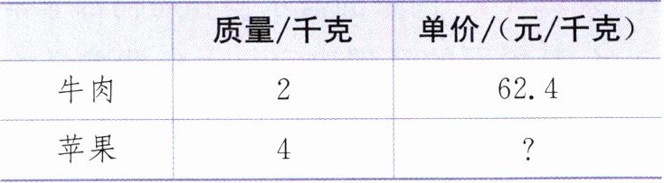 3. (生活应用)王阿姨到超市买了一些牛肉和苹果,一共用去 161.6 元。根据下表中的数据列方程求出苹果的单价。