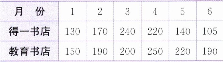 )月得一书店销售的书比教育书店多。(3) 得一书店第二季度平均每月比教育书店少售卖(