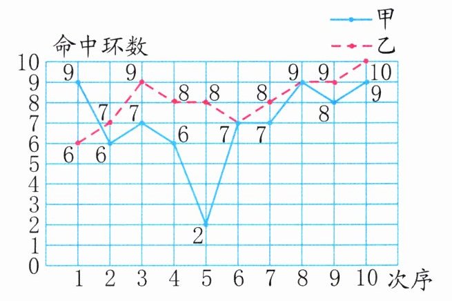 1. 射击队为了提高射击水平,积极组织队员加强训练。下面是甲、乙两位射击运动员训练成绩统计图。