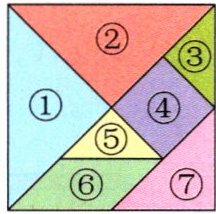 7. (数学文化)七巧板是我国传统益智玩具,它看似简单,却能拼出多种图案。请找一找七巧板中的分数,填一填。