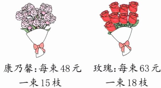 5. (地域景观)云南俗称世界大花园,算一算,1枝康乃馨和1枝玫瑰各多少元? (计算结果用带分数表示)