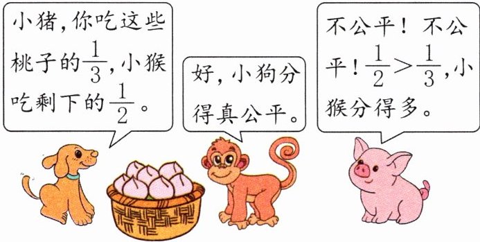 解析:小猪吃了桃子总数的$\frac{1}{3}$后,就剩下桃子总数的1−$\frac{1}{3}$=$\frac{2}{3}$,小猴吃剩下的$\frac{1}{2}$,就是吃了总数的$\frac{2}{3}$×$\frac{1}{2}$=$\frac{1}{3}$,小猪也吃了总数的$\frac{1}{3}$,所以小猪和小猴分得同样多。