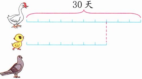 5. (生物百科)鹅的孵化期约是30天,鸡的孵化期约是鹅的$\frac{7}{10}$,鸽子的孵化期约是鸡的$\frac{6}{7}$,鸽子的孵化期约是多少天?(先把线段图补充完整,再列式解答)