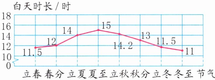 1. (自然科普)古时候人们把一年分为24个节气,如立春、春分、夏至等。下面是某年某地区的部分节气当日白天时长情况统计图,先看一看,比一比,再填空。