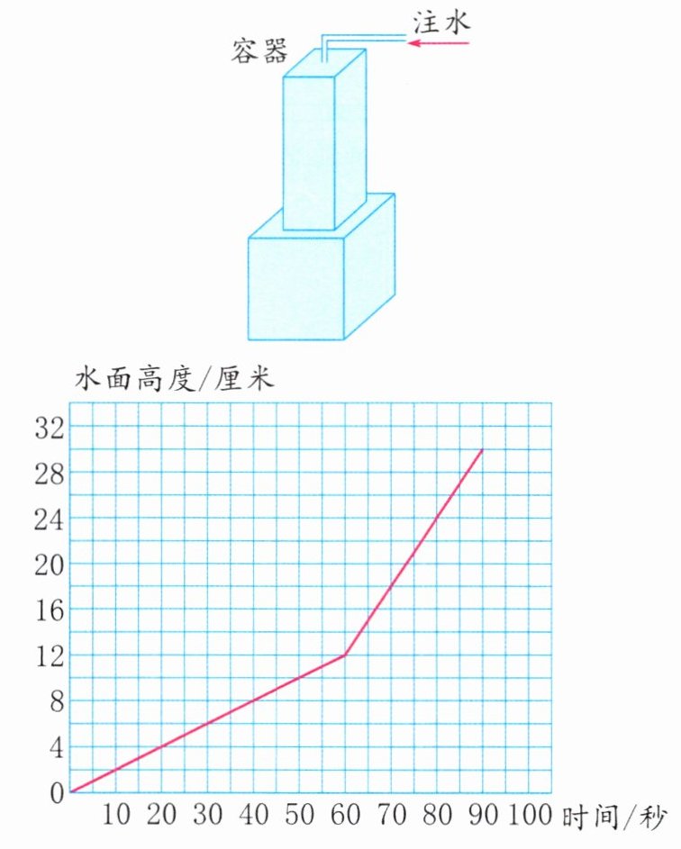 4. (扬州江都区)实验室里,明明正以每秒30毫升的均匀流量向容器(如图)里注水,他记录了容器内水面高度随着时间变化而逐渐升高的全过程。请仔细观察下图,并回答下面的问题。