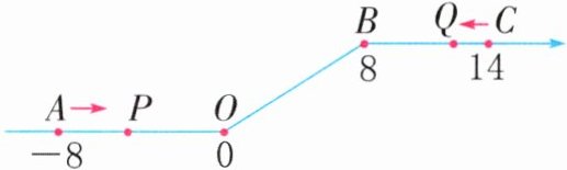 7. (无锡江阴)如图,将一条数轴在点$O$和点$B$处各折一下,得到一条“折线数轴”。图中点$A$表示$-8$,点$O$表示0,点$B$表示8,点$C$表示14,则点$A$和点$C$在“折线数轴”上相距22个单位长度。动点$P$、$Q$同时出发,点$P$从点$A$出发,以每秒2个单位长度的速度沿着“折线数轴”向右移动,从点$O$到点$B$期间,速度变为原来的一半,之后立即恢复原速;动点$Q$从点$C$出发,以每秒1个单位长度的速度沿着“折线数轴”向左移动,从点$B$到点$O$期间,速度变为原来的2倍,之后也立即恢复原速。