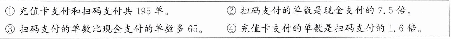 解:设扫码支付有x单。 1.6x + x=195 x=75