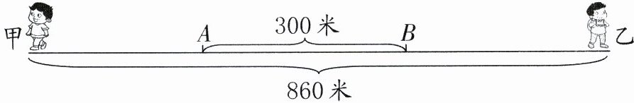 4. 新趋势 数形结合 $ A、B $ 两地相距 300 米,甲、乙两人分别从 $ A、B $ 两地同时出发,相背而行,7 分钟后两人相距 860 米(如图)。已知甲每分钟走 37 米,则乙每分钟走多少米?(6 分)