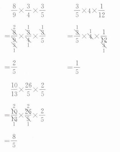 $\dfrac{8}{9}×\dfrac{3}{4}×\dfrac{3}{5}$ $\dfrac{3}{5}×4×\dfrac{1}{12}$ $\dfrac{10}{13}×\dfrac{26}{5}×\dfrac{2}{5}$