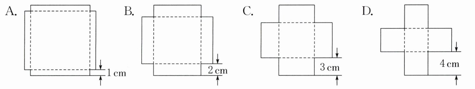 5. 一张边长为12厘米的正方形纸,在它的4个角上剪掉相同的小正方形后,折成一个无盖纸盒。下面4种折法中,(