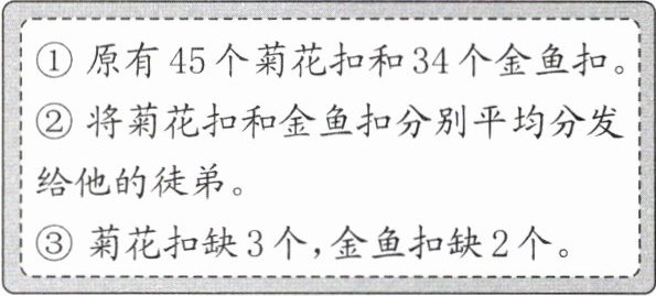 1. 新情境 传统文化 盘花扣是古老中国结的一种,花式种类丰富,有菊花扣、梅花扣、金鱼扣等。下面是云师傅教学时分发盘花扣的情况。他最多有几个徒弟?