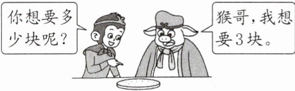 1. 一天,孙悟空要将一张大饼平均分给师徒四人,每人分 1 块。猪八戒看到了,想要多吃几块,在师徒四人分得同样多的情况下,孙悟空满足了猪八戒的要求。你知道孙悟空是怎样分的吗?