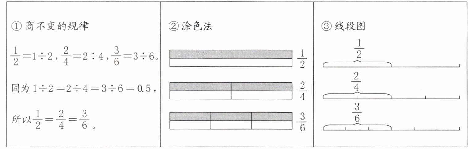 答案:4. D 解析:题中第①种方法将分数转化为除法形式,可以发现1÷2 = 2÷4 = 3÷6 = 0.5,从而得出$\frac{1}{2} = \frac{2}{4} = \frac{3}{6}。$在第②种方法的图中可以发现,只要将一样大小的长方形平均分成偶数份数,涂出总份数的一半,涂色部分大小均相等,从而得出$\frac{1}{2} = \frac{2}{4} = \frac{3}{6}。$第③种方法与第②种方法类似。
