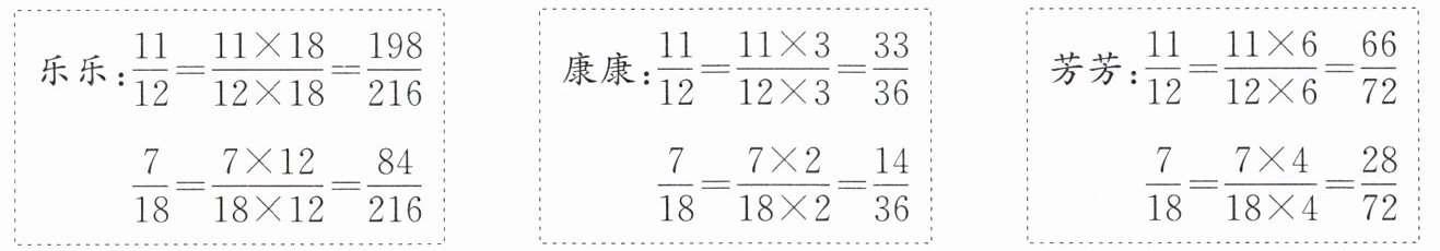 1. 新趋势 说理表达 对$\frac{11}{12}$和$\frac{7}{18}$这两个分数进行通分,三名同学的通分过程如下: