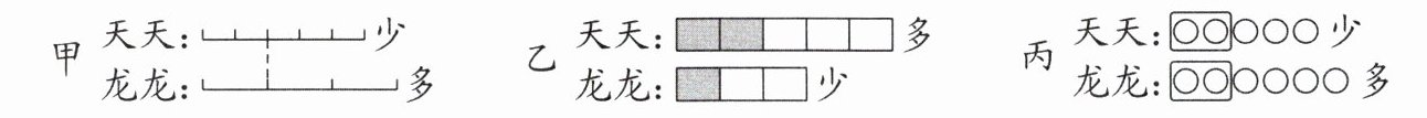 答案:5. C 解析:本题的解题关键是明确两人花的钱同样多。甲和丙的解法中天天花的钱与龙龙花的钱同样多,且画出的各自原来的钱数和比较出的结果都正确。乙的解法中,天天花的钱用2个相同的涂色小长方形表示,龙龙花的钱用1个这样的涂色小长方形表示,花的钱不相同,不符合题意。