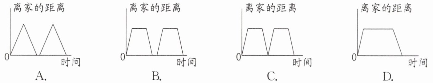 )比较准确地反映了小勇一天的活动情况。答案:2. B 解析:选项A中的图表示小勇去上学,又立刻回家,在学校没有停留,不符合题意。选项C中的图表示小勇中午放学回家又立刻去上学,中间没有停留,同样不符合题意。选项D中的图表示的是小勇早晨去上学,中午没有回家,一直在学校,傍晚放学回家,显然也不符合题意。只有B选项中的图符合题意。