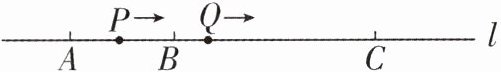 12. 如图,直线 $ l $上有三点 $ A $,$ B $,$ C $,$ AB = 5 $,$ BC = 10 $,点 $ P $,$ Q $分别从点 $ A $,$ B $同时出发,向点 $ C $移动,点 $ P $的速度是 $ m $个单位长度/秒,点 $ Q $的速度是 $ n $个单位长度/秒,$ 2m < 3n $,则在点 $ P $与点 $ Q $之中,点