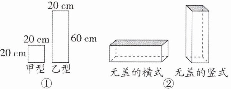 7. (2025·合肥期中)如图①,有边长为20cm的甲型正方形板材和长60cm、宽20cm的乙型长方形板材,可用于制作成如图②所示的无盖的横式(需两张甲型和三张乙型)和无盖的竖式(需一张甲型和四张乙型)两种箱子,制作过程中不计损耗.已知购买任何型号板材单价均为每平方厘米0.02元.