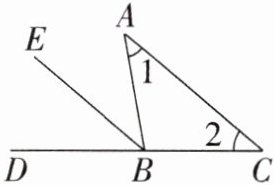 (2) $ ∠ 1 = ∠ A B E $(答案不唯一)。 理由如下:当 $ ∠ 1 = ∠ A B E $ 时,由内错角相等,两直线平行可得 $ A C // B E $,所以 $ ∠ 2 = ∠ D B E $。因为 $ ∠ 1 = ∠ 2 $,所以 $ ∠ A B E = ∠ D B E $,所以 $ B E $ 是 $ △ A B C $ 的外角平分线。
