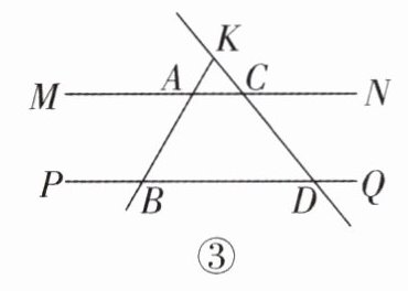 (3)如图③,若∠ABD=60°,直线AB和直线CD相交于点K,点H在PQ上方的直线CD上,试探究∠BAH,∠AHB和∠HBD之间的数量关系,并说明理由.