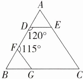 6. (徐州中考)如图,在$△ ABC$中,若$DE// BC$,$FG// AC$,$∠ BDE = 120^{\circ}$,$∠ DFG = 115^{\circ}$,则$∠ C=\_\_\_\_\_\_^{\circ}$。