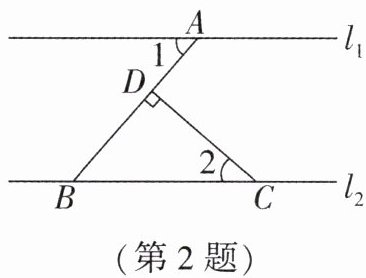 2. (2024·西藏中考)如图,已知直线$l_{1}// l_{2}$,$AB⊥ CD$于点$D$,$∠ 1 = 50^{\circ}$,则$∠ 2$的度数是(