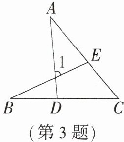 3. (陕西中考)如图,点$D$,$E$分别在线段$BC$,$AC$上,连接$AD$,$BE$。若$∠ A = 35^{\circ}$,$∠ B = 25^{\circ}$,$∠ C = 50^{\circ}$,则$∠ 1$的大小为(