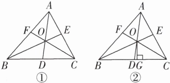 15. 如图①,$△ ABC$各角的平分线$AD$,$BE$,$CF$相交于点$O$。
