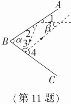 11. 如图,两面镜子$AB$,$BC$的夹角为$∠ α$,光线经过镜子后反射,$∠ 1 = ∠ 2$,$∠ 3 = ∠ 4$。若$∠ α = 70^{\circ}$,则$∠ β$的度数是(