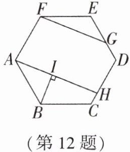 .答案:12. $ 50^{\circ} $ 解析:$ \because $ 正六边形的内角和 $ = (6 - 2) × 180^{\circ} = 720^{\circ} $,每个内角为 $ 720^{\circ} ÷ 6 = 120^{\circ} $,$ \therefore ∠ EFA = ∠ FAB = 120^{\circ} $. $ \because ∠ EFG = 20^{\circ} $,$ \therefore ∠ GFA = 120^{\circ} - 20^{\circ} = 100^{\circ} $. $ \because AH // FG $,$ \therefore ∠ FAH + ∠ GFA = 180^{\circ} $,$ \therefore ∠ FAH = 180^{\circ} - ∠ GFA = 180^{\circ} - 100^{\circ} = 80^{\circ} $,$ \therefore ∠ HAB = ∠ FAB - ∠ FAH = 120^{\circ} - 80^{\circ} = 40^{\circ} $. $ \because BI ⊥ AH $,$ \therefore ∠ BIA = 90^{\circ} $,$ \therefore ∠ ABI = 90^{\circ} - 40^{\circ} = 50^{\circ} $.