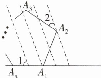 14. 如图, 正 $ n $ 边形 $ A_1A_2A_3··· A_n $ (每条边相等, 每个内角都相等) 坚立于地面, 一边与地面重合, 一束太阳光平行照射在正 $ n $ 边形上, 若 $ ∠ 1 - ∠ 2 = 36^{\circ} $, 则 $ n = $