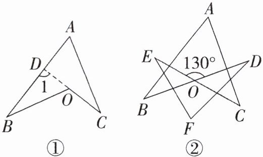 3. 模型规律:如图①,延长$CO$交$AB$于点$D$,则$∠BOC = ∠1 + ∠B = ∠A + ∠C + ∠B$.