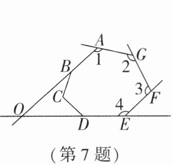 7. 如图,七边形 $ABCDEFG$ 中,$AB$,$ED$ 的延长线交于点 $O$,若 $∠ 1$,$∠ 2$,$∠ 3$,$∠ 4$ 的外角和等于 $215^{\circ}$,则 $∠ BOD$ 的度数为 (