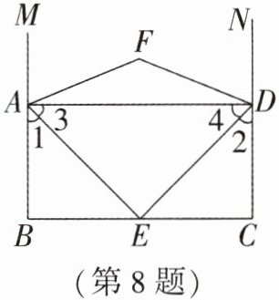 8. 如图,$AB ⊥ BC$,$AE$ 平分 $∠ BAD$ 交 $BC$ 于点 $E$,$AE ⊥ DE$,$∠ 1 + ∠ 2 = 90^{\circ}$,$M$,$N$ 分别是 $BA$,$CD$ 延长线上的点,$∠ EAM$ 和 $∠ EDN$ 的平分线交于点 $F$。下列结论:① $AB // CD$;② $∠ AEB + ∠ ADC = 180^{\circ}$;③ $DE$ 平分 $∠ ADC$;④ $∠ F$ 为定值。其中结论正确的有 (