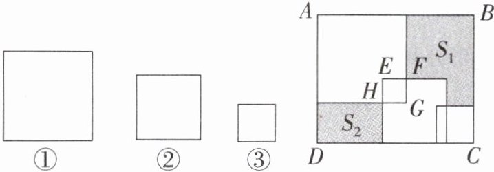 6. (2025·扬州期中)如图,有三张正方形纸片①,②,③,将三张纸片按照如图所示的方式放置于一个长方形$ABCD$中,已知中间重叠部分四边形$EFGH$恰好是一个正方形,记图中两块未被覆盖的阴影部分面积分别为$S_1$和$S_2$,已知$AD = 3$,$AB = 4$,若要知道$S_1$和$S_2$的面积差,只需要知道(
