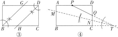 ;(4)折叠长方形纸片ABCD,使得BC落在直线PQ上.请你利用无刻度直尺和圆规,在图④中作出折痕MN(不写作法,保留作图痕迹),其中点M,N分别在边AB,CD上.