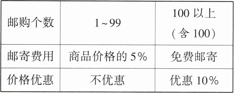 答案:(1)$100×10×(1-10\% )×2=1800$(元)$≠1890$元,则两次邮购商品数量不同.设两次分别邮购商品x个、y个$(x<y),\therefore x<100,y>100$.依据题意可得$\{\begin{array}{l} x+y=200,\\ 10×(1+5\% )x+10×(1-10\% )y=1890,\end{array} $解得$\{\begin{array}{l} x=60,\\ y=140.\end{array} $