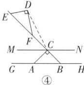 (4)∠CDE = 60°或105°或15°或30°.解析:分两种情况,I.当△DEF向上平移时,①如图③所示,当以C,D,F为顶点的三角形中有两个角相等,即∠DFE = ∠CDF = 30°时,