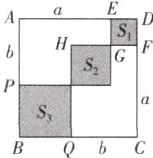(2) $ 12.5 $ 解析:如图,得 $ ED = 6 - a $,$ HG = b - (6 - a) = a + b - 6 $,$ BQ = 6 - b $。因为长方形的周长为 $ 16 $,面积为 $ 15.75 $,所以 $ a + b = \frac{16}{2} = 8 $,$ ab = 15.75 $,所以 $ S_{1} + S_{2} + S_{3} = (6 - a)^{2} + (8 - 6)^{2} + (6 - b)^{2} = 72 - 12(a + b) + 4 + a^{2} + b^{2} = 72 - 12 × 8 + 4 + (a + b)^{2} - 2ab = 72 - 12 × 8 + 4 + 8^{2} - 2 × 15.75 = 12.5 $。