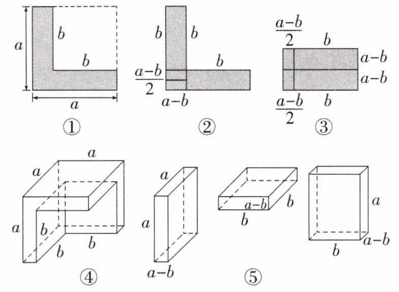 (3)$a^{2}(a - b)+b^{2}(a - b)+ab(a - b)$ 解析:将立体图形分割成三部分,体积分别为$a^{2}(a - b)$,$b^{2}(a - b)$,$ab(a - b)$,其和为$a^{2}(a - b)+b^{2}(a - b)+ab(a - b)=a^{3}-b^{3}$.