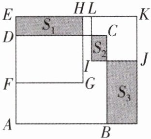 18. (2025·资阳期中)如图,在大长方形中放入三个正方形$ABCD$,$EFGH$,$LIJK$,边长分别为4,3,2.若3个阴影部分的面积满足$3S_{3}+2S_{1}-S_{2}=10$,则大长方形的面积为