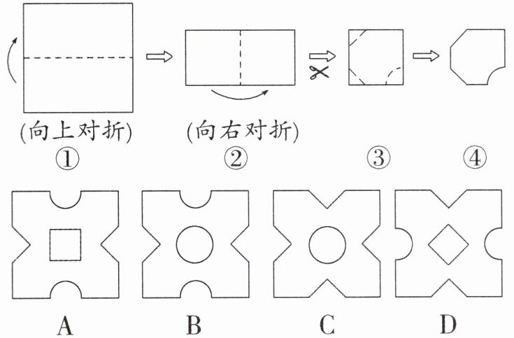 )答案:7.D 解析:根据裁剪结合图示可得,题图④左上角,即展开后正方形垂直方向上是含有线段的图形,题图④左下角,即展开后正方形中间部分是含有线段的图形,题图④右下角,即展开后正方形水平方向是含有曲线的图形,所以只有D选项符合题意.故选D.