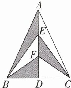 $cm^{2}$.答案:4.9 解析:由题意得直线AD是对称轴,所以 $ S_{△ ABD} = S_{△ ACD} = \frac{1}{2}S_{△ ABC} $, $ S_{△ CEF} = S_{△ BEF} $,所以阴影部分的面积等于△ABC面积的一半,所以 $ S_{阴影} = \frac{1}{2} × 18 = 9(cm^{2}) $.