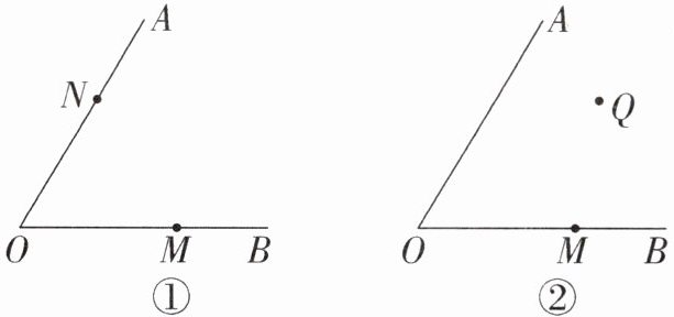 (2)如图②,点$Q$在$∠ AOB$的内部,作出两种不同的四边形$OMPN$,使四边形$OMPN$为轴对称图形,且点$N$在$OA$上、点$P$在$∠ AOB$内部、点$Q$在四边形$OMPN$的一边上.