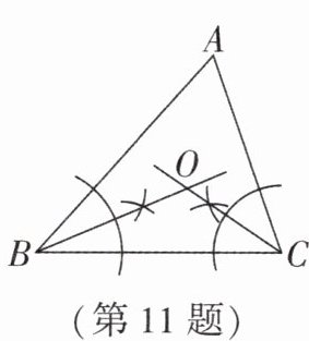 $^{\circ}$.答案:11. 120 解析:由作法可知 BO 平分$∠ ABC$,CO 平分$∠ ACB$,所以$∠ OBC=\frac{1}{2}∠ ABC$,$∠ OCB=\frac{1}{2}∠ ACB$.因为$∠ BOC=180^{\circ}-∠ OBC-∠ OCB=180^{\circ}-\frac{1}{2}(∠ ABC+∠ ACB)=180^{\circ}-\frac{1}{2}(180^{\circ}-∠ A)=90^{\circ}+\frac{1}{2}∠ A$,而$∠ A=60^{\circ}$,所以$∠ BOC=90^{\circ}+\frac{1}{2}×60^{\circ}=120^{\circ}$.