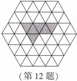 12. 如图,在小正三角形组成的网格中,已有6个小正三角形涂灰,还需涂灰$n$个小正三角形,使它们与原来涂灰的小正三角形组成的新图案恰有3条对称轴,则$n$的最小值是